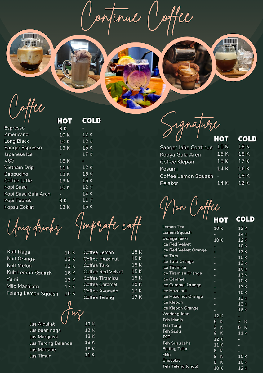 The menu at Continue Coffee is a delightful exploration of coffee and non-coffee beverages, showcasing local ingredients that resonate with both the palate and the spirit. Indulge in the Kopi Susu Gula Aren, a luscious blend of selected coffee beans, fresh milk, and traditional palm sugar, perfect for those looking for a touch of sweetness at just IDR 14,000. If you're feeling adventurous, try the Coffee Lemon Squash, a refreshing mix of coffee, imported lemon, and soda that offers a unique twist on your regular coffee experience for IDR 18,000.